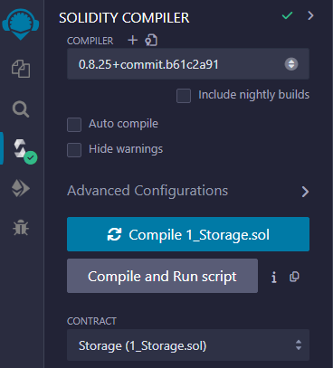 The Solidity logo is present as an icon in the Remix sidebar. Clicking this icon opens the Solidity compiler wizard, which can be used to compile Storage.sol ready. With Solidity.sol open in the editor window, simply click the Compile 1_Storage.sol button. A green tick will appear next to the Solidity icon to confirm that the contract has been compiled successfully. This means the contract bytecode is available.