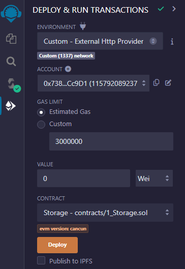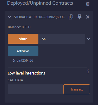 After deploying the contract in Remix, the Deployed Contracts tab in the sidebar automatically populates with the public functions exposed by Storage.sol. To send a value to the contract storage, type a number in the field adjacent to the store button, then click the button.