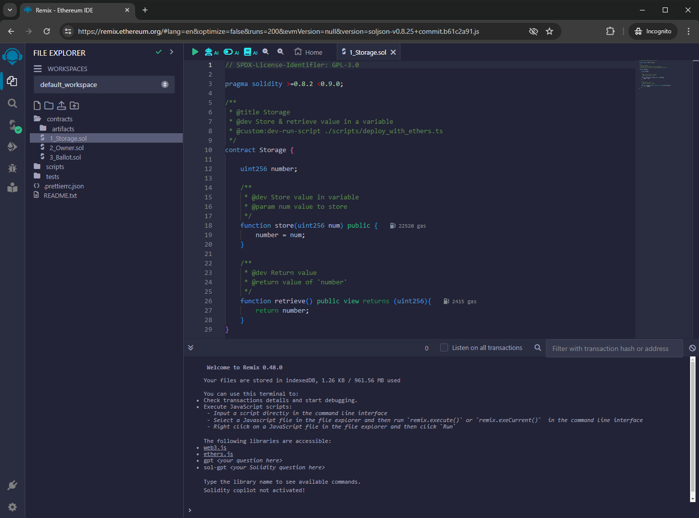 In a web browser, open https://remix.ethereum.org. This opens an online smart contract development environment. On the left-hand side of the screen there is a side-bar menu that toggles between several toolboxes that are displayed in a vertical panel. On the right-hand side of the screen, there is an editor and a terminal. This layout is similar to the default layout of many other IDEs such as VSCode. The contract defined in the previous section, Storage.sol is already available in the Contracts directory in Remix. It can be opened and reviewed in the editor.